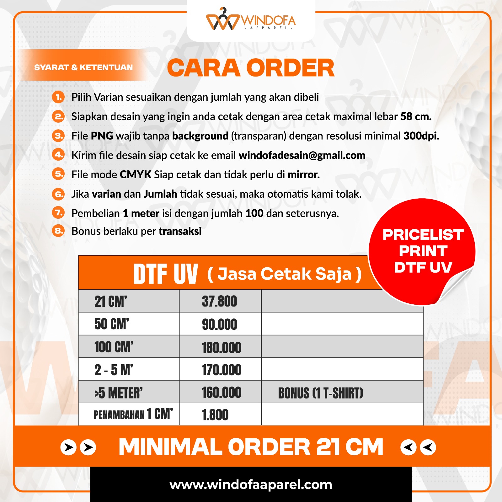 - Kirim desain ke windofadesain@gmail.com dengan subject email nomor Pesanan WEB untuk mempermudah proses.